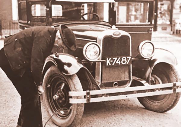 Man in Zuid-Bevelandse streekdracht pompt een band op, Grote Markt in Goes, 1930. Eigenaar van de auto is Kees Smits.